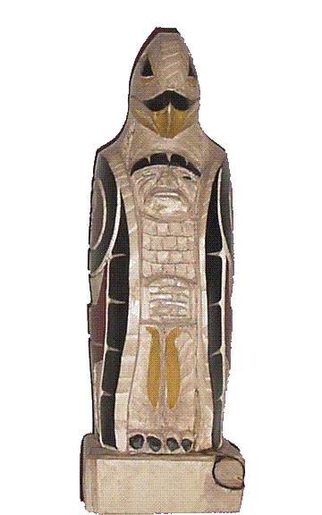 ![]() | Eagle Attends PotlatchThis lovely eagle is 10" x 3.5" x 3.5” carved in pine wood. Although it is small enough to fit on a bookshelf, it is in 3 dimensions and carved in careful detail. Ideal for the small apartment in the big city -- it is a totem than can fit on a bookshelf or bedside table!The eagle represents vision and freedom. Freedom is acknowledging your own freedom first. When you are strong in this then you can share your knowledge with your environment. Vision is knowing that each decision you make in life will effect at least seven generations of your people. In this instance, the Eagle is pretending to be a human who is pretending to be an eagle. The Eagle is participating in the Potlatch, the official ceremony of the Coast Salish People. Herb carves several different bookshelf totems. He has designs for a Raven, a Frog and a Bear all three of which are in bookshelf size. ClickHere to see more bookself totems. |