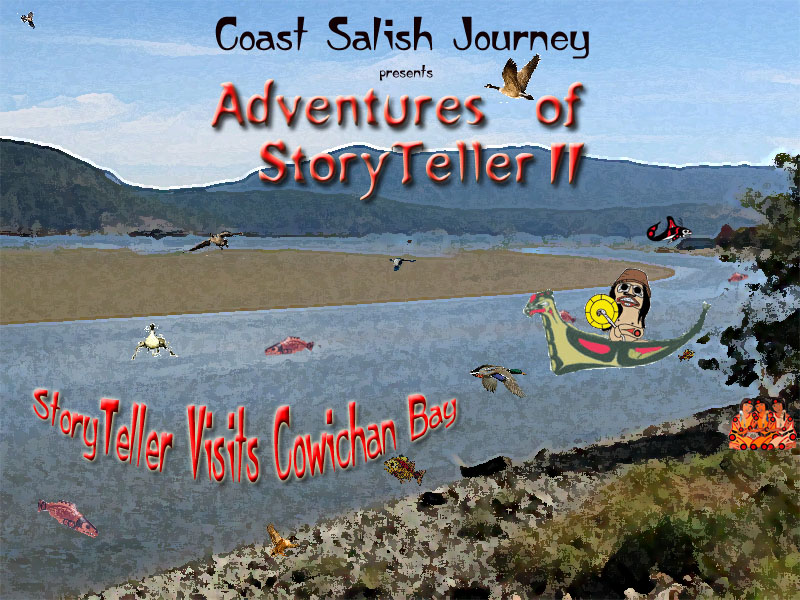 3. Canoe QuestStoryTeller notices that the best plants grow across the river. It is too deep and too fast to cross. After many adventures including diving into the ocean, the Great Hunter teaches StoryTeller how to build a raft, a spear, an adze, and finally, a canoe. | 3. Day Long Duck Hunt StoryTeller came to a village on Cowichan Bay All the men had died from the wars. The women and children were starving. They told him that there were many fowl on the estuary of the Bay and that when the men were alive, they had never been short of food. “I will bring enough food for the whole village.” StoryTeller promised them. So long before dawn the next day StoryTeller walked to the Estuary. He hunted all day and all night to bring food to the hungry villagers. |