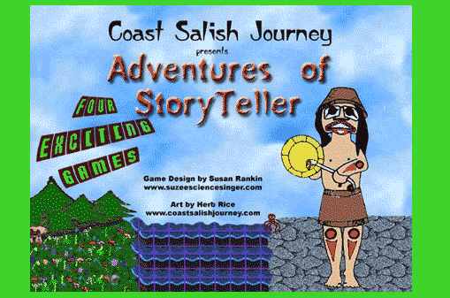 2. Furious Food ForageThe Great Hunter teaches StoryTeller about the plants that grow in the forest. Some are for food, some are for medicine. Now StoryTeller will never be hungry in the forest. | 2. StoryTeller Goes Food FishingStoryTeller arrived at a tiny village on Cowichan Bay. Although the men and women were sick from illness they welcomed him warmly. The children had to fend for themselves and all the villagers were starving. "Before the whiteman came, we could walk across the bay on the backs of the Salmon." an ancient man told StoryTeller. "I will go fishing and I will bring food for the whole village." StoryTeller promised him. |