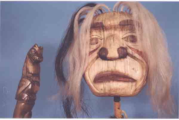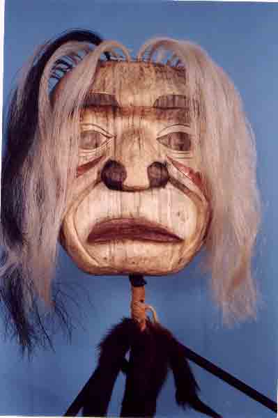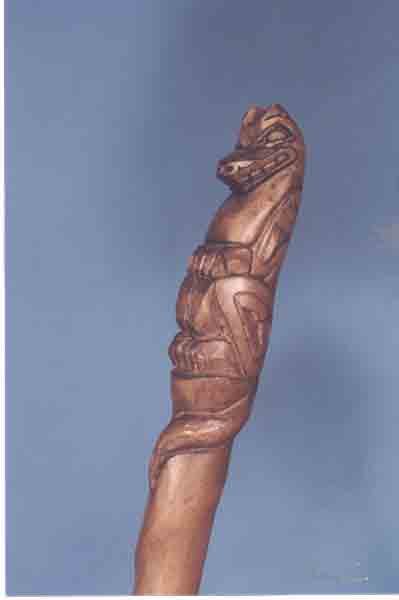 ![]() | Let The Grandmothers SpeakThis standing figure is 4.5' in height. The traditional full head grandmother mask carved in cottonwood with hammered copper is adorned with horsehair. The figure is graced with a steel body adorned with a leather and mink neck ornament. She is holding a 16 inch talking stick topped by an eagle. The talking stick is carved in bass wood.The First Nations of the North West Coast are a Matriarchal Society. This sculpure represents a need for the past to become enjoined with the present. The Grandmothers are putting forward their right to be acknowledged for their wisdom. The talking stick gives them the right to speak and be heard in an honourable way. The talking stick this grandmother is holding represents a wolf which represents family and leadership, the family cannot make life decisions without consulting the leader and the leader in return cannot make life decisions without consulting family. Photos by Ernie Einarsson. |