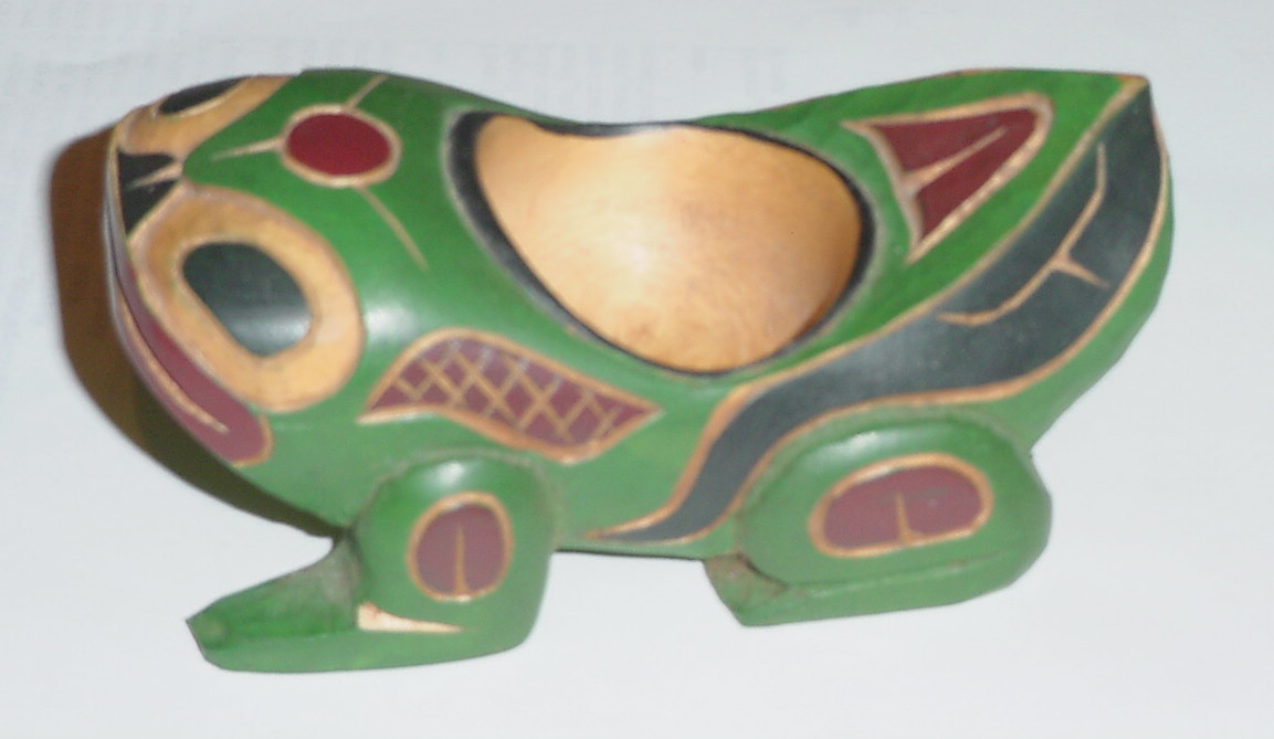 ![]() ![]() | Miniature Frog BowlThis lovely frog bowl is 5" x 3" x 2" carved in yellow cedar. Although it is small enough to fit on a bookshelf, it is in 3 dimensions and carved in careful detail. Ideal for the small apartment in the big city -- it is a totem than can fit on a bookshelf or bedside table! The frog represents transition. When the frogs start to croak in the spring, it is a new beginning for the year. Herb carves several different bookshelf totems. He has designs for a Raven, a Frog, Orca, Eagle and a Bear all of which are in bookshelf size. Click HERE to see some of them. Order one today!! |